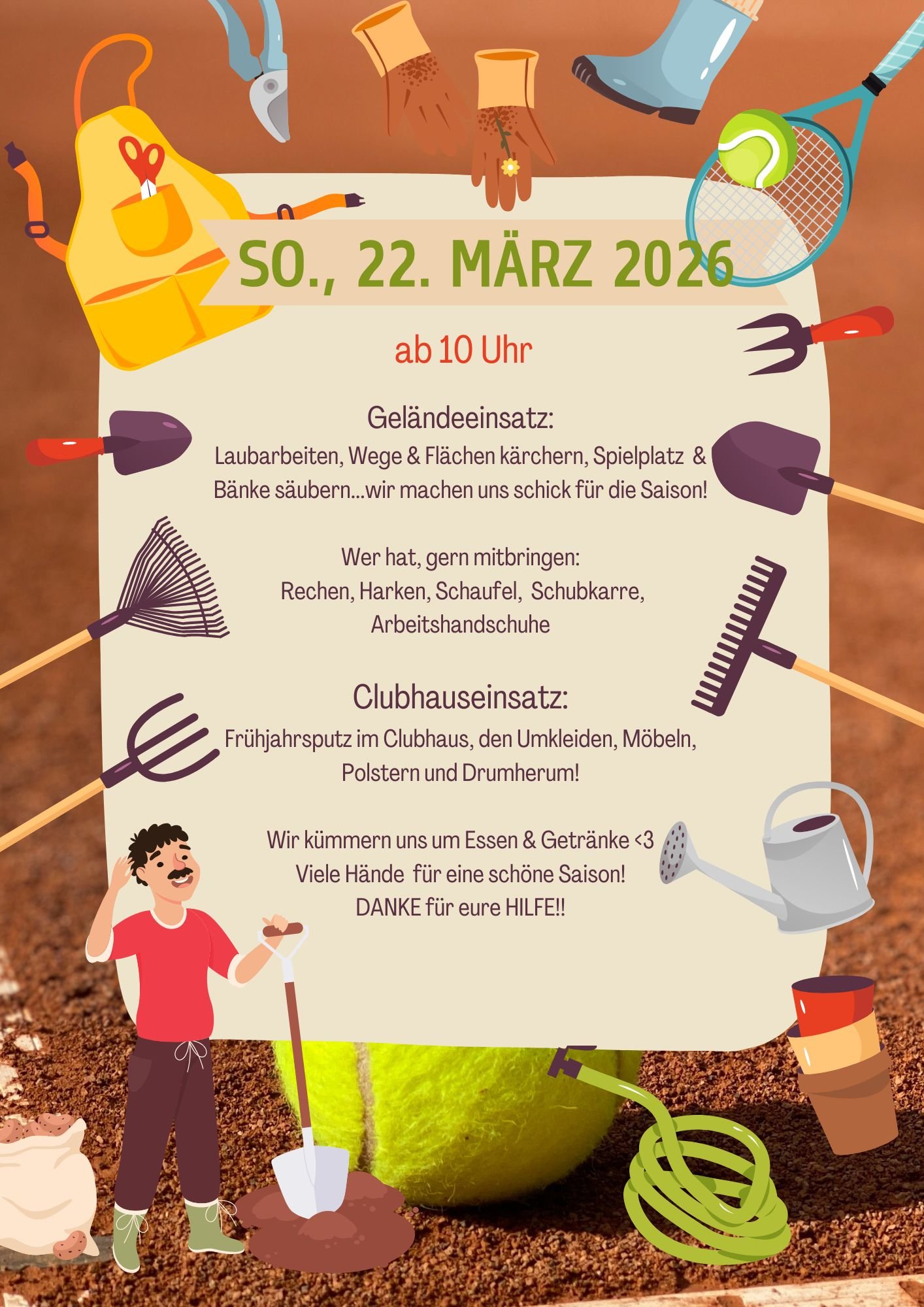 Am 12. Und 19. April sind unsere diesjährigen Platzaufbautage. Bitte meldet euch zahlreich an – viele Hände, schnelles Ende! Dies ist unser erstes gemeinsames Event als frisch gewählter neuer Vorstand des TC: Wir freuen uns auf schöne Samstage in der Gemeinschaft mit euch – auch, wenn ihr nur für 1 h kommen könnt, jede helfende Hand und jedes freundliche Gesicht zählt!